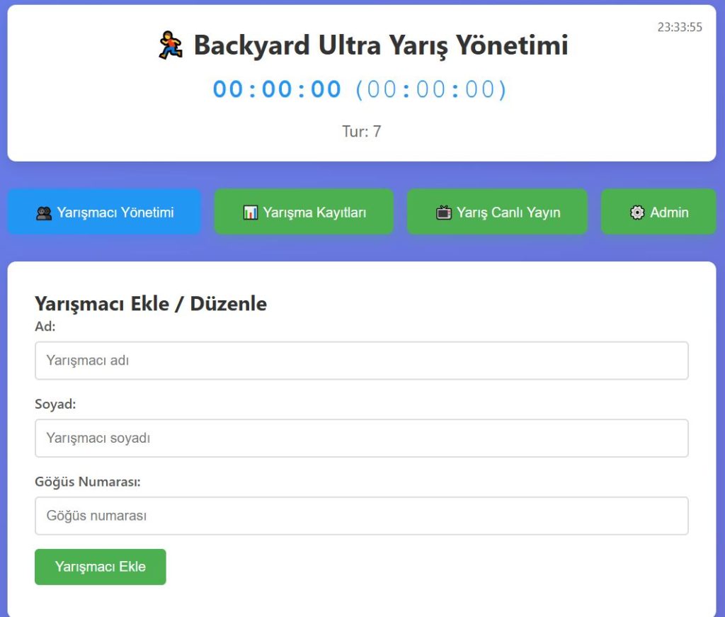 Backyard Ultra, her turda artan heyecanı ve dayanıklılığın sınırlarını zorlayan formatıyla eşsiz bir yarış türüdür. Ancak bu eşsiz format, organizatörler için zamanlamayı, tur takibini ve anlık durumu yönetmeyi karmaşık hale getirebilir. Geliştirdiğimiz bu uygulama, tüm bu zorlukları ortadan kaldırarak size yarışın keyfini çıkarmak için daha fazla zaman bırakır. Tek ihtiyacınız olan bir web tarayıcısı!
